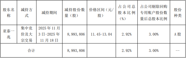 中国经济网北京11月20日讯:正中设计(002811.sz)昨日晚间发布公告称,控股减持已完成。公司于2025年9月26日披露了《关于控股股东减持股份的预披露公告》。控股股东深圳市亚泰一兆投资有限公司(以下简称“亚泰一兆”),持有公司股份141,961,723股(扣除特别股后,占公司总股本的47.33%)。回购账户),计划提前减持。自披露公告之日起15个交易日后3个月内,公司通过集中竞价、大宗交易方式减持不超过8,997,606股。股(占扣除专项回收账户后的公司股本总额的比例不超过3%)。其中,通过集中竞价交易减持股份数量不超过2,999,202股(不超过扣除回购专项账户股份数量后公司总股本的1%),通过大宗交易减持股份数量不超过5,998,404股(占扣除专项回购账户股份数量后公司股本的比例不超过2%)。 2025年11月3日至2025年11月18日,注销亚泰一兆通过集中竞价及大宗交易方式出售其持有的公司股份8,993,806股,占公司总股本的2.92%,扣除回购特别账户(以下简称“回购后”)中的股份数量后,占公司总股本的3.00%。价格区间为11.45元/股至13.04元/股。2025年11月3日至2025年11月18日,正中加权平均价格为12.74元。据此计算,亚泰一兆持股总价值为1.15亿元。本次股权变更后,亚泰一兆将同步持有持有公司股份165,732,417股,占公司总股本的53.81%,占退出后公司总股本的55.26%,截至公告日,亚泰一兆减持计划已实施完毕。