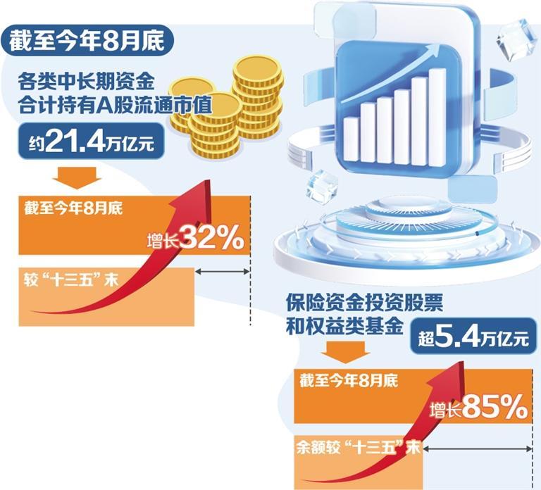 截至今年8月底,各类中长期基金持有的A股流通市值合计约21.4万亿元,较“十三五”末增长32%;保险资金投资股票、权益类基金突破5.4万亿元,余额较“十三五”末增长85%……“十四五”期间,特别是去年9月以来,中长期资金入市规模持续加大,促进了资本市场平稳健康发展。在国新办近日举行的“高质量完成“十四五”规划”系列主题新闻发布会上,中国证监会主席吴清表示,中国将更好发挥中长期资金的“镇流器”和“稳定器”作用,将继续更加密集的考核,将继续提高跨境投融资的便利性,将吸引更多的水流入,努力让更多的全球资本投资中国和中国。分享增长。打开进入市场的卡点。中长期基金是资本市场重要的专业投资力量,是保持市场平稳健康运行的重要支柱。近年来,金融管理部门重点为中长期资金进入市场扫清障碍,推出了一系列有针对性的措施,营造更加良好的制度环境。实现“长期资金、长期投资”。去年9月以来,在中央金融办的指导下,证监会会同有关部门联合印发了促进中长期资金入市的指导意见和实施方案,推动完善各类中长期资金长期考核机制,提高股票型基金规模和比重等,便利中长期资金入市。今年6月,人社部公布一季度全国企业年金数据,首次将“当期收益率”改为“近三年综合收益率”; 7月,财政部下发通知,提高国有保险公司三年长期考核权重,降低国有保险公司长期考核权重本年度的评估。国家金融监管总局先后批准第二批、第三批保险资金长期股票投资试点资格,总额1720亿元;提高部分保险资金权益类资产投资比例上限,最高可达50%;适当降低部分保险资金股票投资的风险权重,明确提出进一步降低保险公司股票投资的风险因素10%。 “未来三年公募基金持有的A股流通市值每年至少增长10%,我们将争取每年溢价的30%投入股市……”对外经济贸易大学金融学教授江平表示,促进中长期资金入市实施方案明确了规模和建议中长期基金投资于长期基金的比例。 A股,并提供了可量化的“硬目标”。明确提出公募基金、国有保险公司等要全面建立并实行三年以上长期考核,为吸引资金、促进长期投资提供制度保障。完善长期考核成为推动中长期基金更好发挥长期投资和投资价值的途径。该概念的主要步骤之一。南开大学金融学教授田立辉认为,在长期考核机制下,机构投资者将更加关注企业的基本面和长期发展潜力,市场资金将逐步向优质资产聚集,促使优质企业获得更多资金支持。同时,medium和pangmatrespect的入驻市场的持续发展将显着优化投资者结构,提高机构投资者比例,从而提高A股市场的整体质量和稳定性。长期资金积累加速。在中长期资金入市渠道未锁定、资本市场稳定向好的同时,各类长期资金正从四面八方汇聚。公募基金作为市场长期资金的重要来源,通过专业的投资服务帮助投资者分享上市公司红利的增长,引导短期交易资金走向长期配置力量。近年来,在强有力的引导和政策支持下,公募基金总规模将不断增加。截至今年8月底,我国公募基金管理规模达36.25万亿元,其中股票型基金规模近10万亿元。已成为最大的pA股市场专业机构投资者。其中,开放式产品即开放式指数(ETF)产品作为标准、低成本的投资工具,对股票基金规模化发挥着重要的推动作用。 “十四五”期间,ETF产品规模再创新高。境内上市ETF数量从370只增加到目前的1282只,资产规模从1.1万亿元增加到超过5万亿元。中国已成为亚洲最大的ETF市场。今年4月,面对外部冲击导致的市场剧烈波动,中央汇金投资有限责任公司通过ETF积极入市,有力支撑了市场的企稳向好。据wind资讯统计,截至6月底,中央汇金及其子公司中央汇金资产管理有限责任公司持有股票ETF总市值1.28万亿元,同比增加较上年末增长22.63%。此外,作为中长期基金的典型代表,社保基金和养老基金规模也不断扩大。人力资源社会保障部副部长李忠此前在国务院新闻办新闻发布会上介绍,目前全国社保基金规模3.22万亿元,养老金主体养老基金重复运营2.6万亿元,比“十三五”末翻倍,企业(占用)年金基金规模达到7元,增幅比“十三五”期末增加4.02万亿元。蒋平表示,中长期资金入市规模的增加,会给市场带来很多积极作用:一是有利于稳定市场。长期资本投资周期长且换手率低,可有效防范短期投机资金造成的剧烈市场波动。二是引领价值投资,提高市场定价效率。长期基金更注重企业基础和长期价值,有助于发现优质企业的合理估值。三是完善公司治理,加强投资者保护。与用脚投票的散户投资者不同,长期基金积极参与公司治理,督促上市公司规范经营,保护投资者权益。打造合适的市场生态,不断吸引更多的长期资金进入市场,离不开适合长期投资和合理回报的市场生态。近年来,证券监管机构一直致力于提高上市公司的投资质量和价值。就其一而言另一方面,继续加强对上市公司的持续监管,提高上市公司信息披露质量,进一步多措并举加强和振兴并购重组和市场重组。今年前8个月,上市公司共披露资产重组1234起,其中重大资产重组152起,同比分别增长40%和150%。另一方面,鼓励上市公司及股东进行回购、增持、分红。今年前8个月,沪深股市新披露回购计划458项,最高回购金额1430亿元;沪深股市披露新增持283只,上限861亿元,价值超过2024年全年。今年以来,分红已超2万亿人民币继续保持高位,中间分