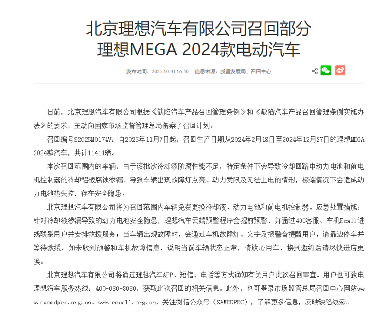 新京报讯 据国家市场监管部门消息,北京理想汽车股份有限公司近日按照《汽车缺陷产品召回管理条例》和《汽车产品召回管理条例实施办法》的要求,主动向国家市场监管部门备案召回计划。召回编号S2025M0174V:自2025年11月7日起,将召回生产日期为2024年2月18日至2024年12月27日期间的总计11,411辆Perfect Mega 2024汽车。对于本次召回范围内的车辆,由于该批次冷却液防腐性能不足,在一定条件下,冷却回路中动力电池和前电机控制器的冷却铝板可能发生腐蚀、泄漏,导致车辆灯亮、动力受限、无法行驶。在极端情况下,这可能会导致热损坏没有动力电池,存在安全隐患。北京理想汽车有限公司将为召回范围内的车辆免费更换冷却液、动力电池和前电机控制器。应急措施:对于冷却液泄漏造成的动力电池安全隐患,理想汽车云预警程序会提前向用户发出预警,并通过400客服和ECALL车辆联系用户安排救援服务;当车辆发生故障时,车辆故障灯、文字、警报会提醒用户靠边停车等待救援。如果您没有收到车辆故障的预警或信息,则表示车辆当前状况正常。请放心使用车辆。请收到邀请后尽快进店换货。编辑 毛天宇