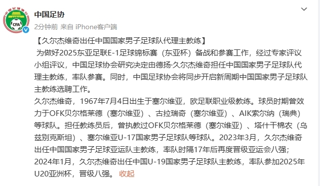 新京报讯 据@中国足协微博消息,为备战和参加2025年东亚足联E-1足球锦标赛(东亚杯),经专家评审组评审,中国足协决定任命德扬·久尔耶维奇为中国国家男子足球队代理主教练并带队参赛。与此同时,中国足协将同步启动新一轮国家男足主教练的招募工作。久尔耶维奇,1967年7月4日出生于塞尔维亚,欧洲足联职业教练。球员时期曾效力于贝尔格莱德Ofk(塞尔维亚)、古拉里奇(塞尔维亚)、艾克索尔纳(瑞典)等队。担任教练后,曾执教贝尔格莱德奥夫克队(塞尔维亚)、塔什干棉农队(乌兹别克斯坦)、塞尔维亚U-17国家男子足球队等队。 2023年3月,久尔耶维奇出任中国国家男足主教练。亚运会,带领球队时隔17年再次晋级亚运会八强。 2024年1月,久尔耶维奇担任中国U-19国家男子足球队主教练,率队参加2025年U20亚洲杯并晋级八强。辛静编辑