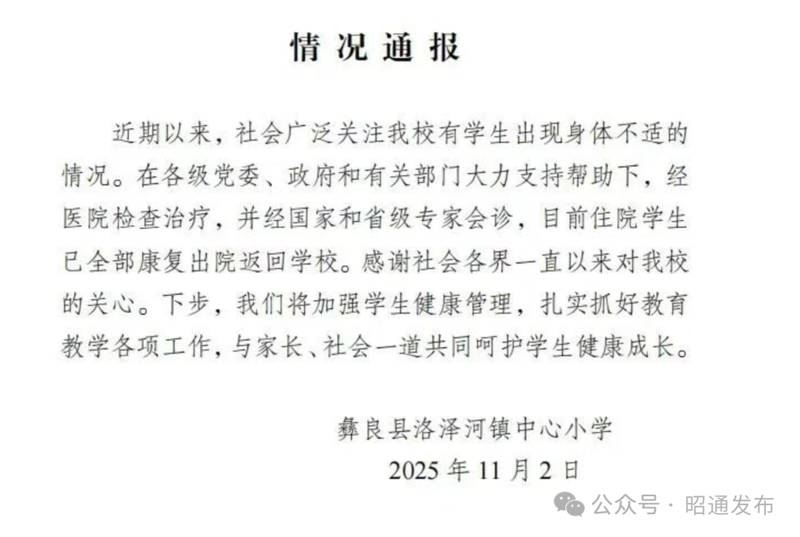 新京报讯 据昭通官方微信公众号报道,11月2日,宜良县洛则河镇中心小学发布情况报告称,学校部分学生情况不佳。经过医院评估和治疗,住院学生全部康复出院并返回学校。据集目新闻10月26日报道,云南省昭通市彝良县洛泽河镇茅坪中心小学岭东村校区,多名学生突然发病。 10月26日,一名学生家长告诉记者,儿子9月初开始出现高烧、呕吐、胃痛、腿软等症状后,曾在多家医院接受治疗,目前尚未完全康复。编辑刘嘉妮